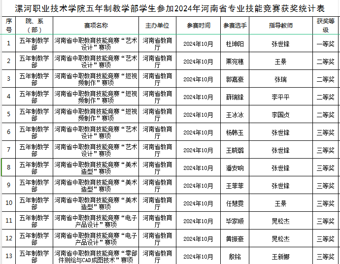 近日,漯职院五年制教学部师生在由河南省教育厅主办的2024年中等职业教育学生专业技能竞赛中再获佳绩,取得省级一等奖1项、二等奖4项、三等奖8项的优异成绩。