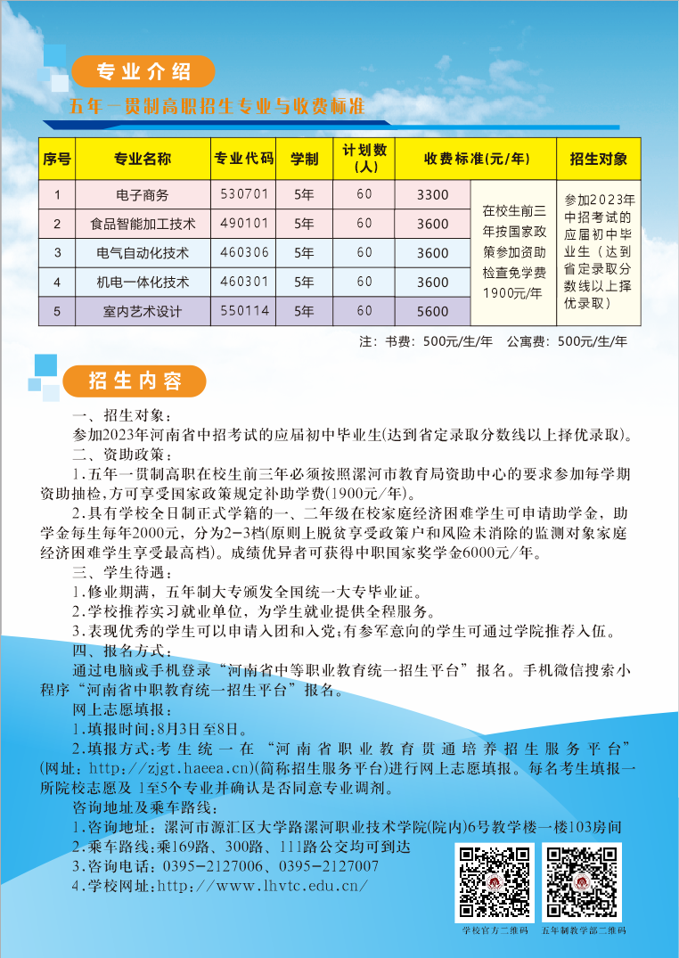 1.五年一贯制高职在校生前三年必须按照漯河市教育局资助中心的要求参加每学期资助抽检,方可享受国家政策规定补助学费(1900元/年)。
