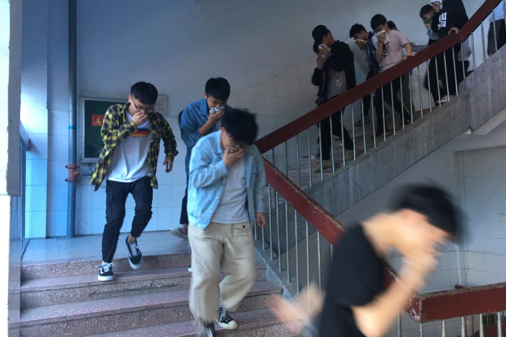 下午14时,随着哨声的响起,演练正式开始。各位老师迅速到达指定位置,确保演练过程学生的安全,并组织学生有序快速疏散。参加演练的学生在老师的指导下,弯腰用手帕捂住口鼻,按照预定路线紧张而有序地迅速“逃离”。