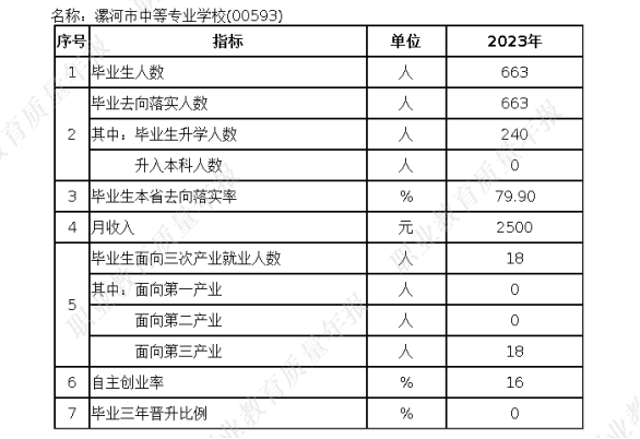 2023年我校共有中职毕业生663人,就业人数260人,就业率达到79.9%。参加对口单招考试升学人数542人,占毕业总人数的81.7%;落实就业单位18人,占毕业生总人数的2.7%;在落实就业单位的18人中,到机关、企事业单位就业的有2人,个体经营的有16人,其它方式就业的有242人。